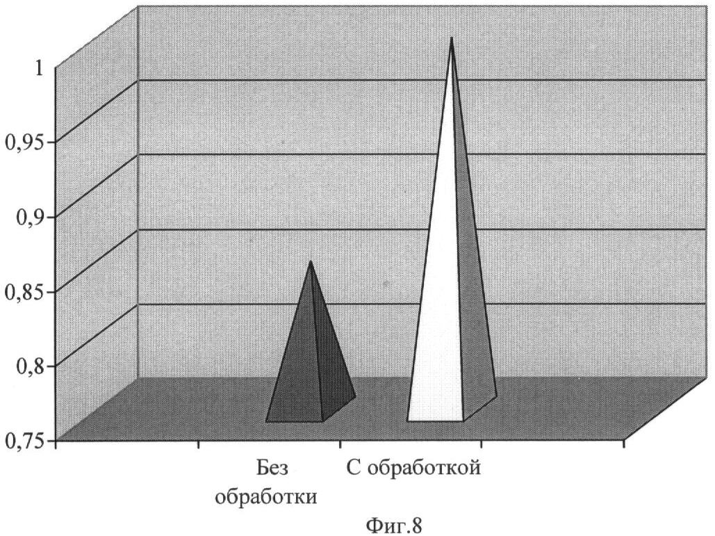 На фиг.8 – значения теплового эффекта, полученные в мобильном тепловом пункте без предварительной обработки жидкости на входе и при неоптимальных параметрах элементов пункта и в мобильном тепловом пункте с предварительной обработкой жидкости на входе и при оптимальных параметрах элементов пункта.