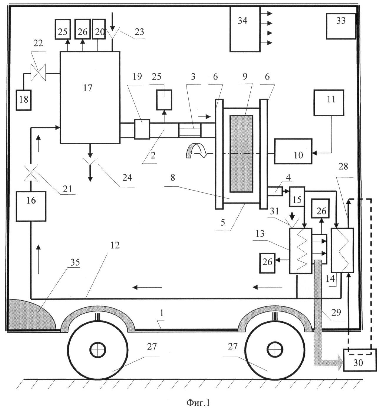 Наиболее близким к изобретению по технической сущности и достигаемому результату является мобильная автономная система теплоснабжения, содержащая привод, выполненный в виде дизельного двигателя, к входу которого подсоединен теплообменник-утилизатор отходящих газов, подключенный выходом через насос к вихревому теплогенератору, а последний выходом подключен к расширительному баку и через потребителей тепловой энергии, например отопительные радиаторы, подключен к входу в теплообменник утилизатор (см. патент на полезную модель RU 30179, кл. F24D 15/00, 20.06.2003).