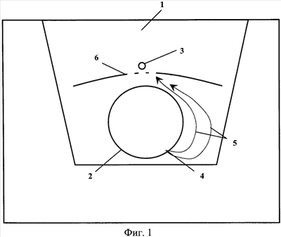 В соответствии с фиг.2 распределенный оптоволоконный датчик 3 температуры расположен зигзагообразно в горизонтальной плоскости над трубопроводом 2. Направление потока газа из места 4 утечки показано стрелками 5. Преобладающее направление течения газа из места утечки – вверх, к поверхности земли, преимущественно через засыпку с углом расширения потока газа около 90 градусов. Осуществляют непрерывное измерение температуры, по падению которой судят о наличии и месте утечки.