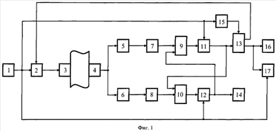 Экспериментальная проверка работоспособности и эффективности предлагаемого устройства для контроля качества материалов осуществлялась путем измерения с его помощью скорости распространения импульсного ультразвукового сигнала частотой 60 кГц в гранитном блоке с базой L=0,5 м. При идеальных контактных условиях излучающего и приемного пьезопреобразователей с гранитным блоком, достигаемых применением контактной смазки и повышенным давлением на преобразователи, устройство срабатывало по первой полуволне принятого сигнала, о чем свидетельствовало срабатывание индикатора. При этом измеренное время tp1 составило 102 мкс, а Сp1=L/tp1=0,5/102 мкс=4902 м/с. Затем измерения были проведены без принятия специальных мер обеспечения надежных контактных условий преобразователей с блоком гранита. При этом измеренное время tp2 составило 110,3 мкс, Сp2=L/tp2=4533 м/с, а соответствующая относительная погрешность ср=[Сp1-Сp2)/Сp1 7,5%. Однако, поскольку во втором случае сработал второй индикатор 14, сигнализирующий о том, что срабатывание устройства произошло по отрицательной полуволне принятого сигнала, значение Сp2 не было принято за истинный результат измерения, что позволило также исключить неправильную оценку качества контролируемого блока. При измерении с помощью устройства-прототипа скорости распространения ультразвука Сp3 в том же блоке гранита (без принятия специальных мер по обеспечению надежных контактных условий с ним преобразователей) были получены значения tp3=118,6 мкс, Сp3=L/tp3=4216 м/с и ср 14%.