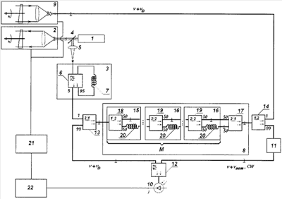 Пассивные оптоволоконные разветвители 13 и 14 (с конфигурацией портов 2*1), подключенные соответственно к входу и выходу оптоволоконного мультипликатора 8, имеют соотношение коэффициентов деления 1:99. При этом порты, реализующие меньшие значения коэффициента деления, подключены соответственно КОР 3 и приемной оптической антенне 9. Напротив, порты, реализующие меньшие значения коэффициента деления, сопряжены с входными портами сумматора опорной и сигнальной волн 12. При этом акустооптический модулятор может быть установлен между оптоволоконным мультипликатором 8 и сумматором 12, как после оптоволоконного разветвителя 13, так и после оптоволоконного разветвителя 14. Для управления и контроля антенн в составе лидара используется система их управления 21, функционально связанная с процессором 22. Последний электрически соединен системой 21 и фотоприемником 10.