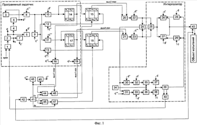Элементы 1, 2, 3, 4, 5, 6, 7, 8, 9, 10, 11, 12, 13, 14, 16, 17, 19 входят в состав программного задатчика. Все элементы от 25 до 40 входят в состав интерполятора.