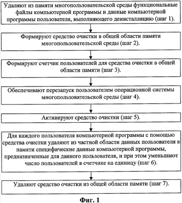 Рассмотрим пошаговое выполнение заявленного способа деинсталляции в многопользовательской среде (Фиг.1). Сначала выполняют обычные операции деинсталляции, а именно удаляют из памяти многопользовательской среды функциональные файлы компьютерной программы и данные компьютерной программы пользователя, выполняющего деинсталляцию (шаг 1). Затем формируют средство очистки в общей области памяти многопользовательской среды, при этом заносят в него информацию о структуре и расположении специфических данных пользователей компьютерной программы в памяти (шаг 2). Формируют счетчик пользователей для средства очистки в общей области памяти многопользовательской среды, при этом заносят в него список с числом пользователей компьютерной программы (шаг 3). Осуществляют перезапуск пользователем операционной системы многопользовательской среды (шаг 4). Активируют средство очистки (шаг 5). Для каждого пользователя компьютерной программы с помощью средства очистки удаляют из частной области данных пользователя в памяти специфические данные компьютерной программы, предназначенные для данного пользователя, и при этом уменьшают число пользователей в счетчике на единицу (шаг 6). Удаляют средство очистки из общей области памяти (шаг 7).