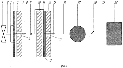 Источник вращения 1 на фиг.1 имеет номинальную мощность 1 кВА, количество оборотов 50 с-1. Уединенная емкость, выполненная из медной пластины толщиной 0,005 м в виде диска диаметром 0,5 м, крепится с помощью изолирующего приспособления 3 крепления к валу отбора мощности 2. При вращении уединенной емкости в полюсном пространстве источника магнитного поля 5 с площадью поверхности полюса Sп=0,6 м2 и индукцией магнитного поля В=3·10-4 Тл на токосъемном передающем электроде 6 генерируются высокочастотные электромагнитные колебания с номинальной частотой fн=100 МГц. Энергия передается от токосъемного передающего электрода 7 через воздушный зазор 8 на приемный электрод 9 внешней ветви 10 спирального волновода в виде искрового разряда электрического тока силой до 1 А. Спиральный волновод 12 выполнен из медной ленты длиной 1000 м, толщиной 0,001 м и шириной 0,05 м, с изоляцией между витков 0,001 м. Изменяя зазор между токосъемным электродом 7 и приемным электродом 9, получают частоту резонанса уединенной емкости и спирального волновода при непрерывном искровом разряде в воздушном зазоре 8 между передающим электродом 7 и приемным электродом 9. Особенностью спирального волновода, расположенного в меж полюсном пространстве постоянных магнитов, является его способность работать в режиме резонанса напряжений или резонанса токов, накачивая электромагнитную энергию с последующим освобождением запасенной энергии. По существу резонансная система 4-15 представляет аналог лазера, работающего в диапазоне частот 10 КГц-100 МГц при максимально возможной мощности. Накачка электромагнитной энергии в спиральном волноводе происходит следующим образом. При подаче электроэнергии от токосъемного передающего электрода 7 на приемный электрод 9 внешней ветви 11 спирального волновода с частотой электромагнитных колебаний от 10 кГц до 100 МГц спиральный волновод 12 становится спиральным резонатором в режиме резонанса напряжений. Изменяя зазор между токосъемным электродом 7 и приемным электродом 9, получают непрерывный искровой разряд в зазоре и режим резонанса токов в спиральном резонаторе за счет электрической и магнитной энергии резонансной системы, образуемой уединенной емкостью и спиральным волноводом.