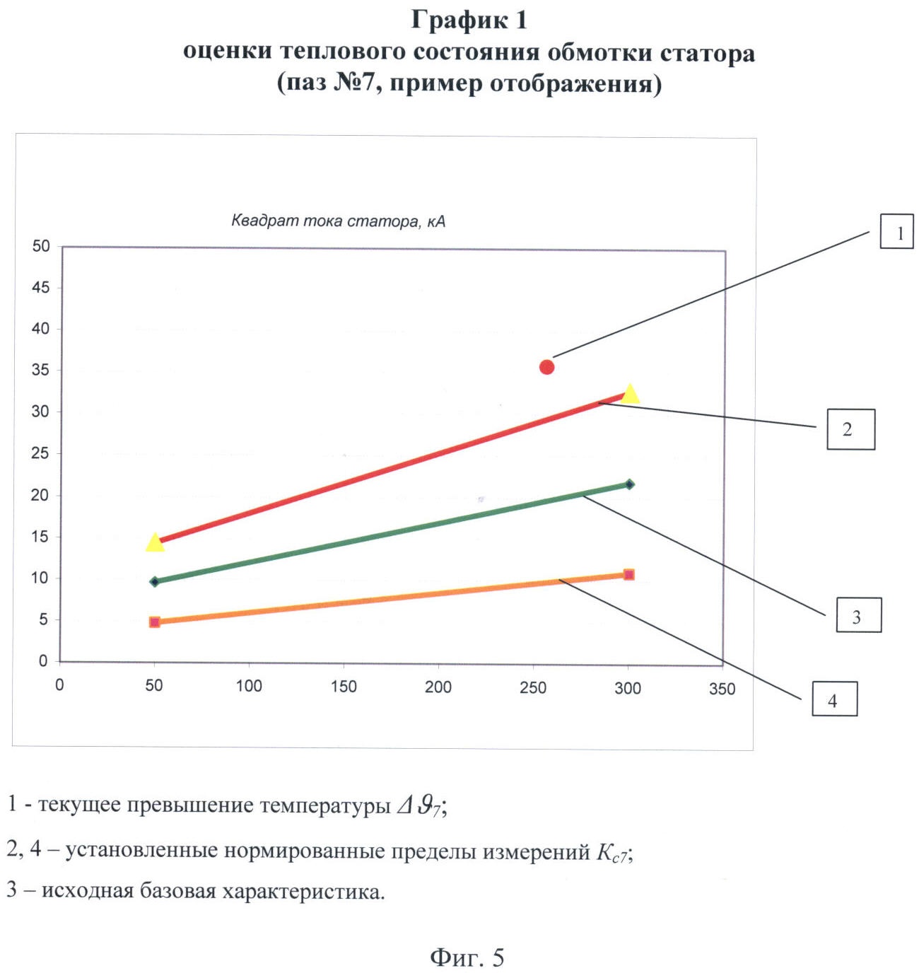 На фиг.5 приведен график 1 оценки теплового состояния стержня обмотки статора, паз 7, позволяющий показать отличие текущего значения превышения температуры обмотки  ij, определенного по формуле (1), от базового превышения  ij*: