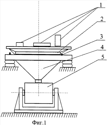 Вибрационные испытания проводились по схеме, показанной на фиг.1, где 1 – блоки РТР, 2 – оснастка для крепления блоков РТР, 3 – задающие ВИП, 4 – оснастка стенда, 5 – вибростенд. На фиг.2 показана схема испытаний сотовой панели с приборами в акустической камере, где 6 – это контрольные датчики ускорений (ABC132). Испытания проводились в реверберационной акустической камере РК660. Панель с приборами устанавливалась в центре камеры на высоте от пола ~1.5 м