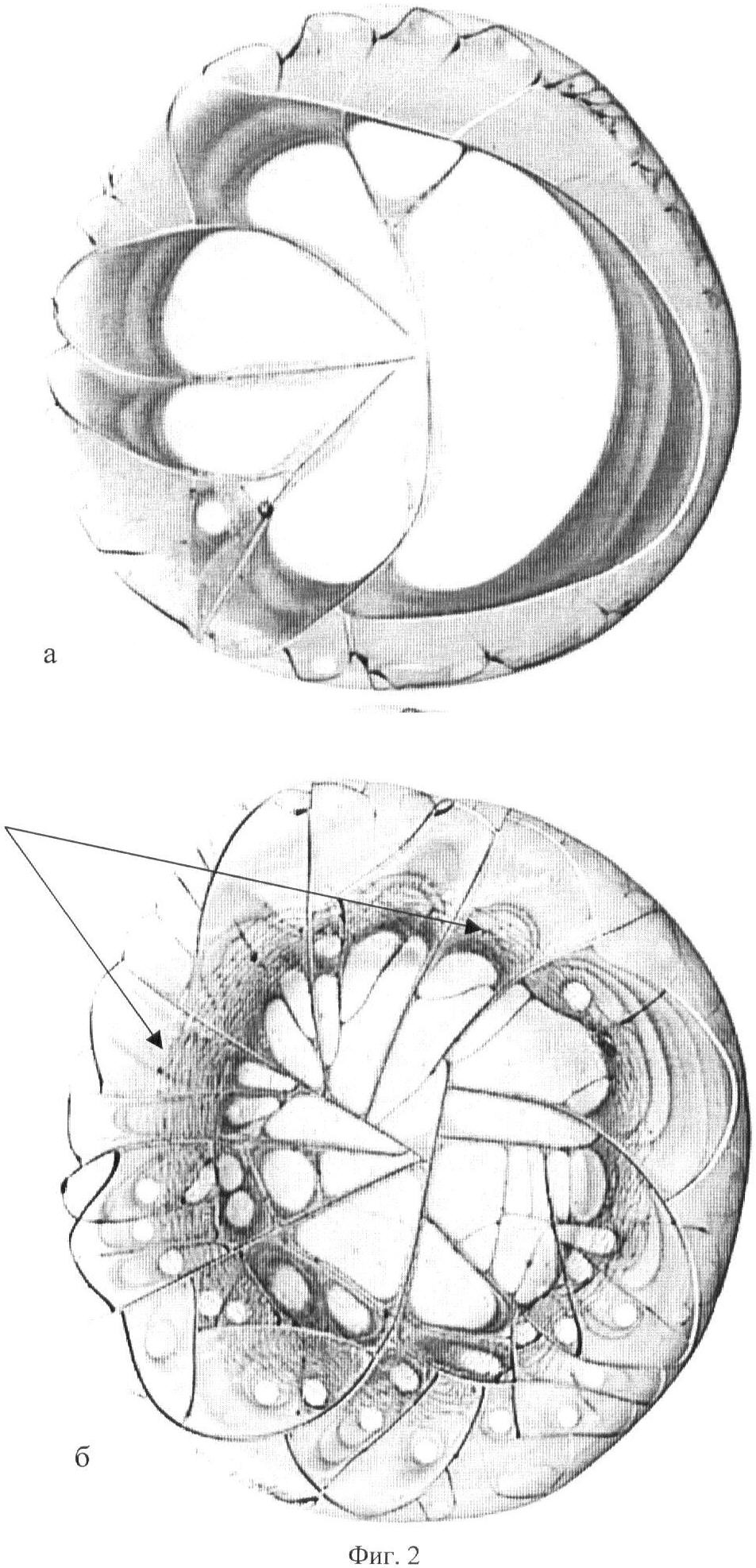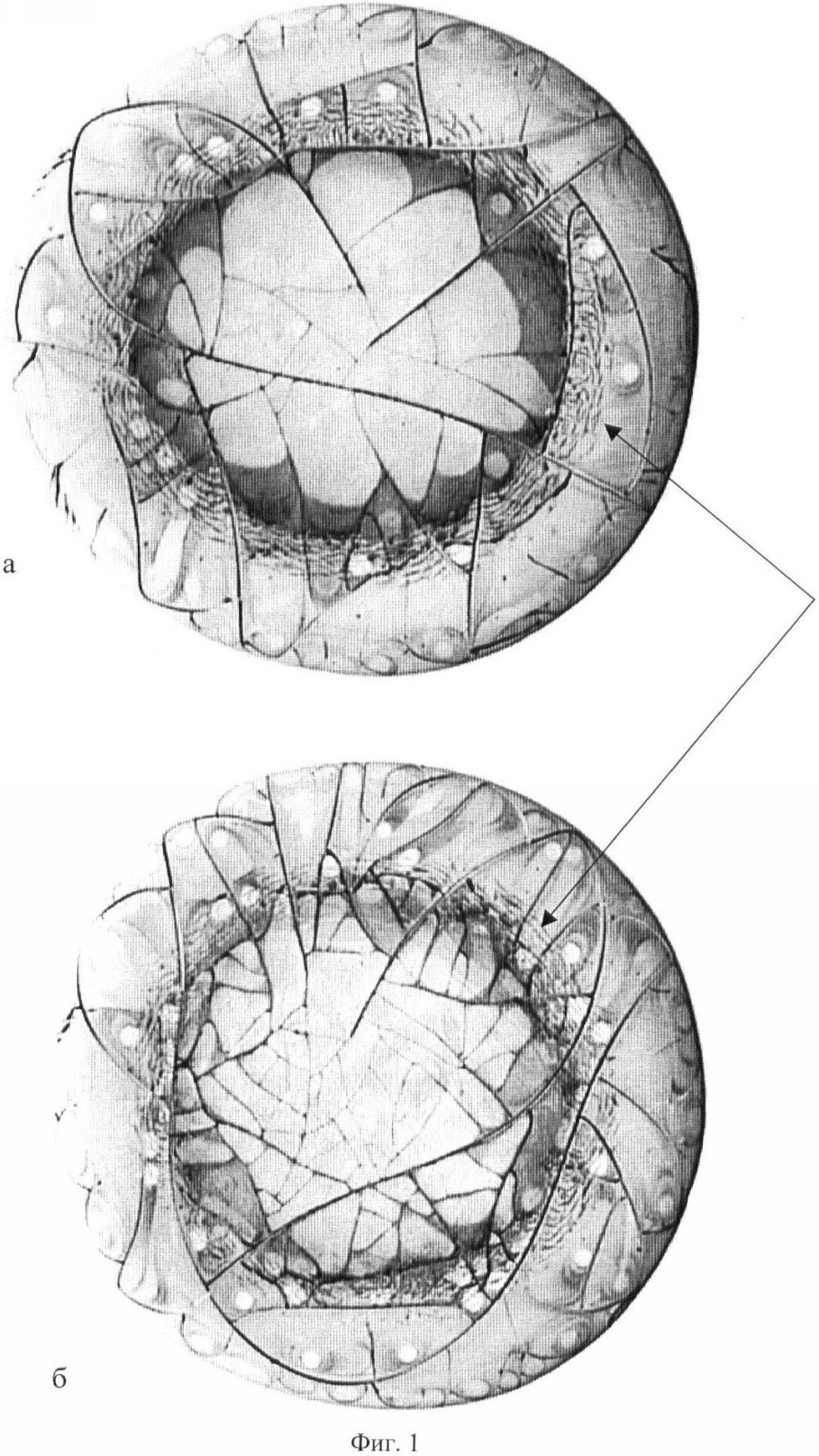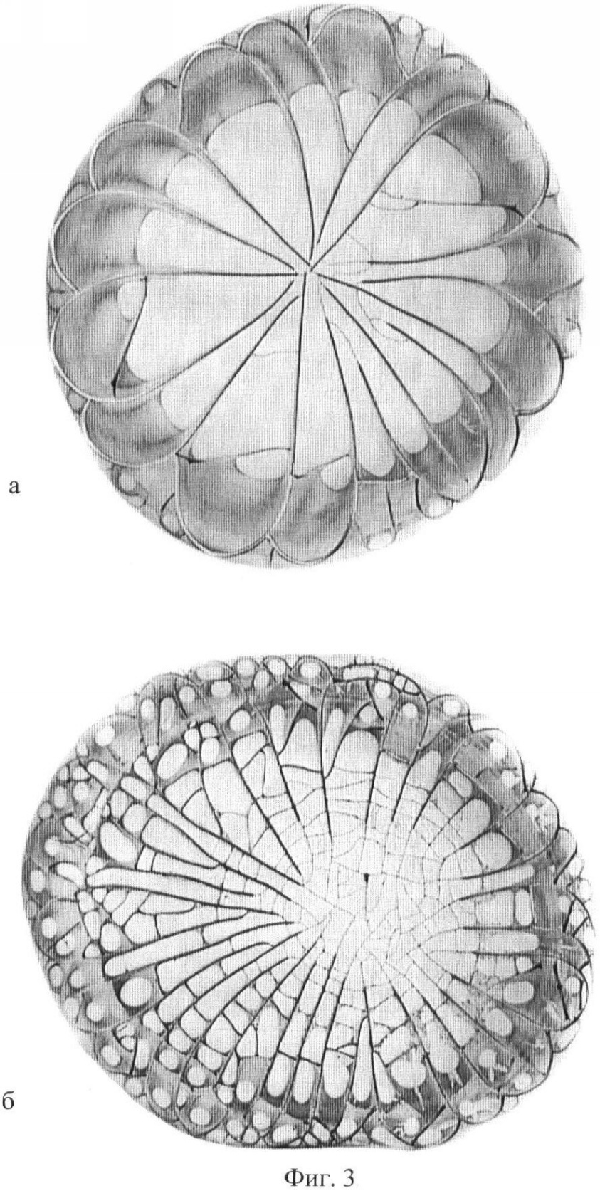 При исследовании морфологической картины указанным способом свежей и суточной фаций сыворотки крови больной с опухолью молочной железы сразу после проведенного курса лечения (50 грей) обнаружено в промежуточной зоне обеих фаций наличие коротких дугообразных трещин. Причем особенно четко они проявляются в свежей фации. Эти короткие дугообразные трещины в промежуточной зоне являются маркером воздействия на организм ионизирующего излучения в ранние сроки (до 3 месяцев) воздействия.