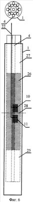 Первое измерение n- радиационного портрета проводится при загрузке конструкции с ОТВС в стальной пенал 1. Как показано на фиг.6, конструкция с ОТВС содержит в своей нижней части область длиной около 3 м, заполненную хвостовиками 25 ОТВС, затем располагается примерно 6-метровая активная часть 26 и, наконец, верхняя область длиной ~3 м, заполненная верхними частями 27 ОТВС. Вначале в пенал 1 опускают конструкцию с ОТВС, не доводя до дна примерно на 1 м, и получают конфигурацию, представленную на фиг.6. У боковой поверхности пенала 1 строго напротив одной из ОТВС 4 внешнего ряда на уровне центра активной части 28 располагают на штанге 22 конструкцию из двух блоков детекторов 10 и 11. Это единственная возможность проконтролировать расположение одного из детекторов каждого блока строго напротив одной из ОТВС 4, так как при загрузке можно дистанционно наблюдать за положением каждого детектора блока относительно видимых верхних частей ОТВС 27.