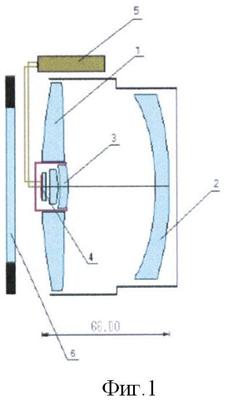 Объектив работает следующим образом. Световой поток от объекта, расположенного в бесконечности, проходит через линзовый компонент 1, выполненный в виде двуяковыпуклой линзы с отверстием в центральной части, затем через вогнутое зеркало Манжена 2, выполненное в виде отрицательного мениска без отверстия в центральной части, отразившись от его второй зеркальной поверхности, проходит через фокальный компонент 3, выполненный из двух положительных линз и установленный в центральном отверстии линзового компонента 1, за которым он формирует изображение в плоскости наилучшей установки, где размещена ПЗС-матрица 4, соединенная с электронной платой видеокамеры 5, затем с помощью диафрагмирующей маски со светофильтром 6, установленной за линзовым компонентом 1, регулируется его освещенность в зависимости от времени суток. Светофильтр 6 может быть фотохромным, электрохромным или нейтральным, так как объектив за счет применения стекла одной марки является строгим апохроматом.