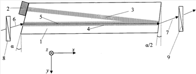 На чертеже приведен общий вид предлагаемого устройства. Коллинеарный акустооптический фильтр состоит из звукопровода (1), выполненного в виде призмы, протяженной вдоль кристаллографической оси х, пьезопреобразователя (2), расположенного на грани звукопровода (1), скошенной под углом к оси х в плоскости ху в сторону положительной оси у. Противоположная ей грань, отражающая ультразвук, имеет аналогичный скос под углом, равным /2. На чертеже обозначены: поз.(3) – ультразвук, который распространяется к торцевой грани, скос которой выполнен под углом, равным /2, отраженный от этой грани ультразвук обозначен позицией (4), распространяется вдоль оси х кристалла. Поз.(5) обозначен преломленный взаимодействующий световой луч, поз.(6) – входной световой луч, а поз.(7) – дифрагированный луч. Устройство также содержит входной поляризатор (8), выходной анализатор (9), расположенный на оптическом выходе устройства.