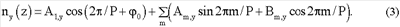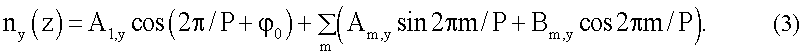 В качестве примера, иллюстрирующего способ, рассмотрим слой холестерического жидкого кристалла толщиной 8 микрон и шагом спирали Р=1,2 мкм. Пространственное распределение поля директора nx(z) и ny(z) имеет вид, показанный на Фиг.1. В фурье-образе Fnx(z-1) х-компоненты директора можно видеть лишь одну основную гармонику, что соответствует синусоидальному (гармоническому) распределению директора, Фиг.1. Пусть диэлектрическая и магнитная анизотропия жидкого кристалла отличны от нуля. Если в таком слое создать электрическое или магнитное поле перпендикулярно оси спирали с величиной меньше некоторого порога раскрутки спирали, то спираль сохранится, но распределение поля директора будет деформировано. Распределение х- и у-компонент директора более не будет описываться синусоидальным законом и будет содержать дополнительные гармоники:
