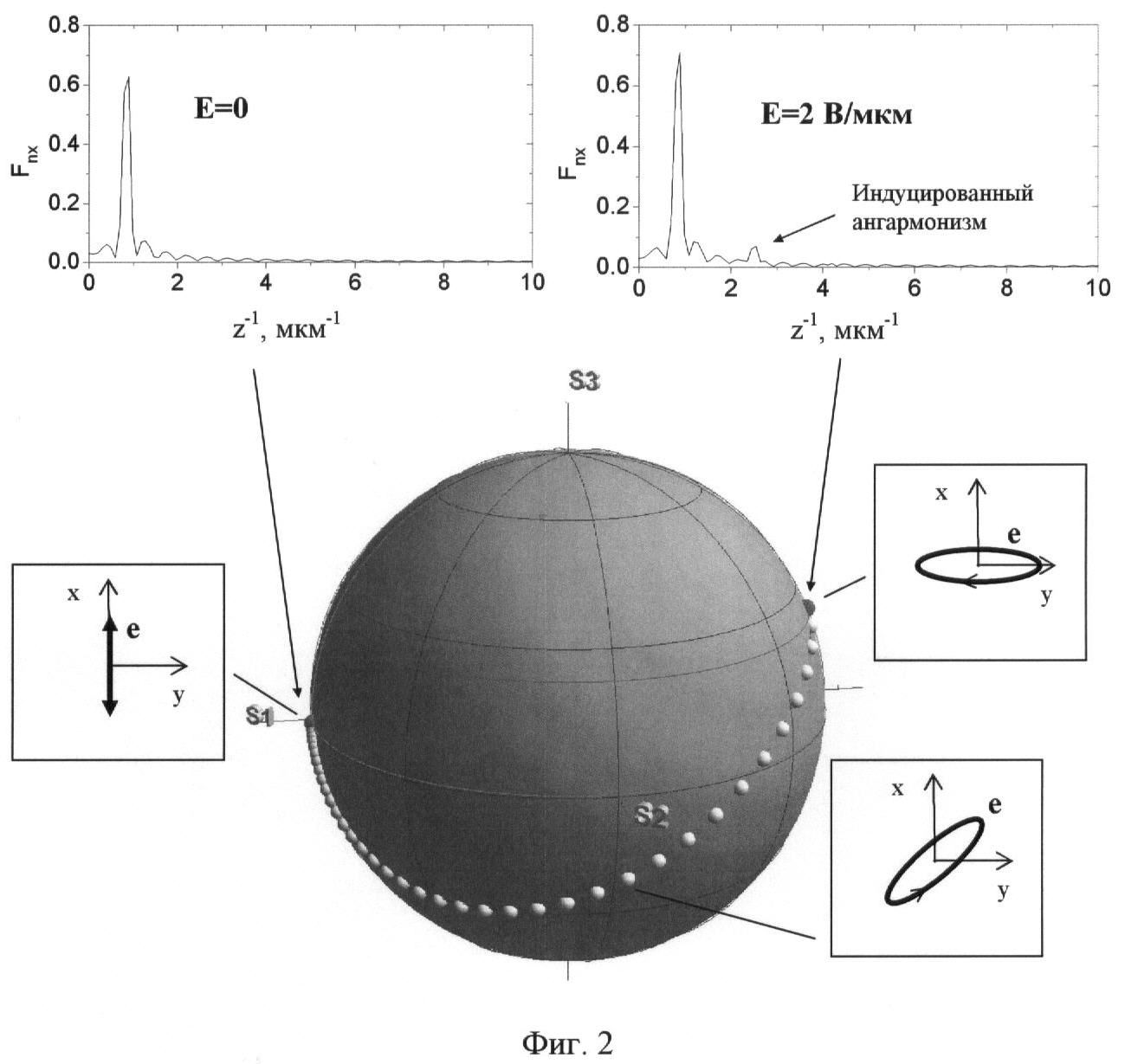В соответствующих фурье-спектрах от пространственного распределения директора появятся дополнительные гармоники. В силу синусоидальности начального распределения директора и квадратичного характера взаимодействия с полем это будут, главным образом, нечетные гармоники (m=2k+1, где k – натуральные числа), амплитуды которых характеризуют степень индуцированной ангармоничности. Важным и отражающим суть способа настоящего изобретения является то, что даже малая степень индуцированной ангармоничности спирали может приводить к существенным изменениям состояния поляризации прошедшего через жидкокристаллический слой света. На Фиг.2 показаны фурье-образы пространственного распределения х-компоненты директора при выключенном (Е=0) и включенном (Е=2 В/мкм) электрическом поле, а также на единичной сфере Пуанкаре изображена эволюция состояний поляризации света на выходе слоя при изменении поля от нуля до 2 В/мкм с шагом 0,05 В/мкм. Как видно, в поле 2 В/мкм индуцированная ангармоничность проявляется в виде лишь третьей гармоники. Степень этой ангармоничности, определенная как отношение амплитуд третьей и первой гармоник, составляет около 7%. Однако даже при столь малой степени ангармоничности состояние поляризации на выходе слоя меняется почти на ортогональное.