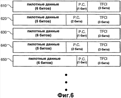 Один вариант осуществления этого альтернативного формата временных интервалов показывается на фиг. 6. Как показано на фигуре, первый временной интервал 610 включает в себя шесть битов пилотных данных, один бит данных управления мощностью и три бита данных TFCI. Второй временной интервал 620 включает в себя пять битов пилотных данных, два бита данных управления мощностью и три бита данных TFCI. Третий временной интервал 630 идентичен временному интервалу 610 и включает в себя шесть битов пилотных данных, один бит данных управления мощностью и три бита данных TFCI. Таким образом, поэтому временной интервал 630 начинает повторять шаблон временных интервалов 610 и 620. Этот шаблон продолжается для временных интервалов 640-650 и остатка временных интервалов в кадре.