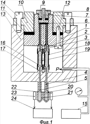 Верхние жесткие части 2 и 3 каналов заполнения соединены с нижними жесткими частями 16 и 17 каналов заполнения посредством разделительных элементов, например, в виде эластичных трубок 18 и 19. Нижние жесткие части 16 и 17 каналов заполнения 4 и 5 соединены с толстостенными измерительными камерами высокого давления 20 и 21, рядом с которыми или на которых располагаются измерительные датчики 22 и 23, соединенные с измерителем 24 прибора или установки для исследования жидкостей при высоком давлении.
