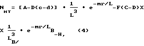 Сущность способа базируется на следующих физических закономерностях. В однородной водородосодержащей среде пространственное распределение надтепловых нейтронов описывается хорошо известным уравнением вида![]() в неводородосодержащей среде уравнением вида ![]() где A – постоянный коэффициент, пропорциональный активности стационарного нейтронного источника; L – длина замедления быстрых нейтронов в горных породах; r – длина зонда; m – постоянный коэффициент. Из (1) и (2) легко вычислить длину замедления быстрых нейтронов L, располагая измерениями потока надтепловых нейтронов (Nнт) в средах. Однако эти уравнения справедливы для однородных сред. Наличие скважины, заполненной, как правило, водородосодержащим флюидом, приводит к нарушению однородности среды и непредсказуемым погрешностям в определении длины замедления быстрых нейтронов L. Найдем приближенное уравнение пространственного распределения надтепловых нейтронов при измерениях прибором диаметром d в скважине произвольного диаметра с. Известно, что наличие скважин с водородосодержащим флюидом приводит к уменьшению регистрируемого потока надтепловых нейтронов. Это уменьшение обусловлено, с одной стороны, утечкой части нейтронов из горной породы в скважину, с другой, – интенсивным рассеянием быстрых нейтронов в аномальном водородосодержащем замедлителе. Тогда уравнение (1) может быть представлено в виде: ![]() где A’ и B – функции размера скважины и длины замедления быстрых нейтронов в скважинном флюиде (Lв). Представим “эффект скважины” линейной функцией от диаметра, A’ = A-D (c-d) и ![]() где F – постоянный коэффициент; Lв – длина замедления быстрых нейтронов в скважинном флюиде. Тогда уравнение (3) примет вид ![]() где H – постоянный член уравнения, введенный для учета передачи нейтронного излучения через корпус прибора, и не зависит от скважины. Уравнение (4) при с = d переходит к изотропному случаю (с добавлением Н). При L = LB влияние скважины исчезает, т.е. вновь изотропный случай. Из последнего следует, что при L = в тогда F = -D. С учетом последнего уравнение (4) принимает вид:![]() Это уравнение получено в предположении, что при облучении и измерении все нейтроны в среду и из среды попадают минуя рассеяние в самой скважине. Для учета рассеяния первичных нейтронов в скважине правую часть уравнения следует умножить на сомножитель характеризующий вероятность рассеяния нейтронов на расстоянии от источника быстрых нейтронов r < Lв. С учетом отмеченного математическая модель пространственного распределения быстрых нейтронов в водородосодержащей среде может быть окончательно представлена уравнением:![]() Аналогично можно сразу написать математическую модель для неводородосодержащей среды, имея в виду уравнение (2): ![]() В уравнениях (6) и (7) m2 соответствует m. Математические модели 6) и (7) получены на основе реальных физических представлений о природе переноса нейтронного излучения, они удовлетворяют граничным условиям при c = d и L = Lв и поэтому могут быть использованы для практических определений длины замедления быстрых нейтронов практически в любых горных породах, пересеченных скважинами. В уравнения входят четыре неизвестных постоянных коэффициента и один постоянный член, которые могут быть определены по измерениям в средах с известными значениями быстрых нейтронов L, флюида Lв, диа