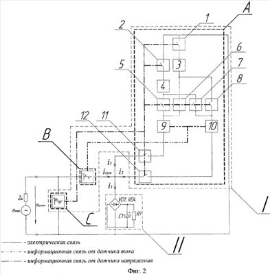 Устройство I состоит из блока накопления и передачи электрической энергии (фиг.2, А), блока анализа формы тока в линии (фиг.2, В), блока анализа формы напряжения сети (фиг.2, С).