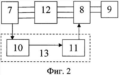 Фиг.2 отображает общую схему компенсатора, где 7 – трехфазная сеть; 8 – блок силовых вентилей; 9 – дроссель с зазором; 10 – блок анализа трехфазной сети, предназначенный для вычисления необходимой реактивной мощности и определения моментов переключения вентилей; 11 – блок управления переключением вентилей; 12 – LC-фильтр высоких частот. Блоки 10 и 11 могут быть объединены в один – блок управления вентилями 13, при реализации функций этих блоков на микроконтроллере. Блок силовых вентилей 8 входом подключен через LC-фильтр высоких частот 12 к трехфазной сети 7, к выходу блока 8 (сторона постоянного тока) подключен дроссель с зазором 9. Блок 10 производит анализ трехфазной сети, т.е. блока 7, после чего данные с блока 10 поступают в блок 11 для осуществления управлением блоком 8.