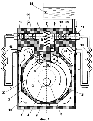 В связи с вышеизложенным, при возвратно-поступательном движении разделительной пластины 6 возникает пульсирующий поток охлаждающей и смазывающей жидкости, направленный справа – налево (по чертежу) и протекающий из насосной полости 9 в отверстие 10 и далее через теплообменник 16, охлаждающую полость 18, теплообменник 19, отверстие 11, насосную полость 9, а затем – снова в отверстие 10. То есть – возникает замкнутое круговое движение смазочно-охлаждающей жидкости. Частично эта жидкость, через микрозазор между стенками полости 7 и разделительной пластиной 6, попадает в цилиндр 2 и разносится по его стенкам ротором 5, образуя тонкую смазочную пленку, предотвращающую активное трение ротора 5 о стенки цилиндра 2 и разделительную пластину 6, после чего со сжатым газом уносится через нагнетательный клапан 17. Расход охлаждающей и смазывающей жидкости пополняется из резервуара 15.