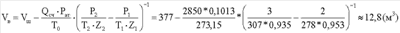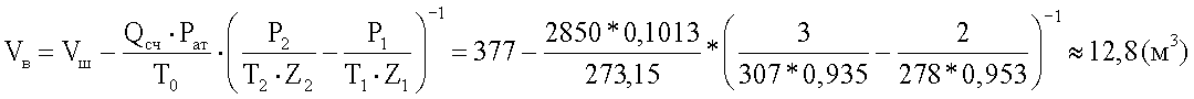 Изобретение относится к горному делу и может быть использовано при исследовании промысловых газопроводов (шлейфов) на наличие и определение объема жидкости в них. Известен способ, при котором осуществляется бесконтактный замер уровня жидкости на отдельных участках промыслового газопровода при помощи нейтронного тестирования, основанного на регистрации отраженных от контролируемой среды числа замедленных нейтронов, испускаемых источником быстрых нейтронов (см. Маслов В.М. «Концепции анализа и совершенствования техники и технологии промысловых подготовки и транспорта газа». Ташкент, издательство ФАН, 1997, стр.622-625). Недостатком данного метода является то, что для определения наличия жидкости в промысловом газопроводе участок трубы должен быть освобожден от грунта. При этом с целью исключения фоновых шумов от влажной почвы размер шурфа должен быть таким, чтобы на расстоянии не менее 0,5 м от точки замера труба была полностью открыта. Выполнение таких условий требует дополнительных материальных затрат и снижает оперативность измерений. Помимо этого, при использовании данного метода необходимо знать фактический геометрический профиль промыслового газопровода для прогнозирования мест возможного скопления жидкости. В многолетней промысловой практике эксплуатации нефтяных и газовых месторождений широко известен способ, при котором осуществляется непосредственный замер количества жидкости, находящейся в газопроводе, путем слива жидкости из специальных конденсатосборников (см. Гужов А.И. и др. Сбор, транспорт и хранение природных углеводородных газов. М., «Недра», 1978, стр.109-110). Недостатками данного метода являются низкая эффективность при больших затратах материальных средств и трудовых ресурсов, а также невозможность постоянного контроля за уровнем наполнения конденсатосборника жидкостью, что во многих случаях приводит к их переполнению, росту гидравлических сопротивлений в газопроводе и безвозвратным потерям газа. Целью данного изобретения является повышение эффективности работ по определению объема водной фазы в промысловом газопроводе. Это достигается тем, что промысловый газопровод с накопленной водой перекрывается с обеих сторон, в отсеченном участке промыслового газопровода повышается давление путем закачки газа одновременно с измерением объема закачиваемого газа, величина которого относится к объему газа в промысловом газопроводе как 1:3, с учетом объема закачанного газа и изменения термобарического состояния газа в промысловом газопроводе, рассчитывается объем воды в промысловом газопроводе. Предлагаемый способ осуществляется следующим образом. Рассчитывается геометрический объем Vш внутреннего пространства промыслового газопровода диаметром D, протяженностью L. В случае составного промыслового газопровода общий объем рассчитывается с учетом объема каждого участка. С помощью запорной арматуры вход и выход газа из промыслового газопровода герметично перекрывается и в нем регистрируются давление P1 и температура Т1. По вспомогательному трубопроводу через газовый счетчик в промысловый газопровод с помощью источника высокого давления (компрессора, бустера, агрегата дожимной компрессорной станции и т.д.) подается дополнительный объем газа. При этом дополнительный объем относится к объ