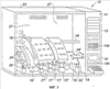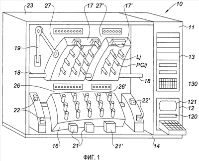 Средства измерения находятся под стороной матриц (i, j), где i=1, , n, и j=1, , m, датчиков Cij относительного смещения, поддерживаемых зажимными губками, в описываемом варианте имеется нижняя зажимная губка 16, прикрепленная к каркасу 23, и две верхние зажимные губки 17 и 17′, которые могут поворачиваться вокруг оси 18, выполненной как одно целое с каркасом 23. Датчики Cij выровнены вдоль линий Lj матриц 16, 17, 17′, соответствующих профилям j сечения детали 15.