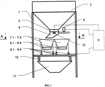 Под вращающимся дозатором 4 расположены несколько (минимум, четыре) весоизмерительных устройств (ВУ) 7.1-7.4, выполненных в виде емкостей, в нижней части которых размещены управляемые шиберы 8.1-8.4, причем сами емкости установлены неподвижно и опираются на тензометрические преобразователи давления 9.1-9.4, закрепленные на опорной раме 1 и связанные своими выходами с блоком управления и обработки информации 6.