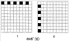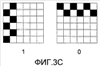Альтернативные представления битов значениями 0 и 1 показаны на фиг.3С-3Е. Следует понимать, что представление нуля или единицы для кодирования выборок, показанное на фиг.3А-3Е, можно менять одно на другое без эффекта. На фиг.3С показаны представления битов, занимающие две строки или два столбца в перемежающемся расположении. На фиг.3D показано альтернативное расположение элементов изображения в строках и столбцах в пунктирных линиях. И, наконец, на фиг.3Е показаны представления элементов изображения в столбцах и строках в формате с неодинаковыми промежутками (например, в виде двух темных точек с последующей неокрашенной точкой).