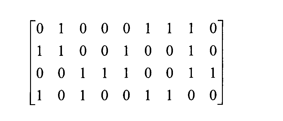 Для создания изображения 303, показанного на фиг.3В, можно использовать различные потоки битов. Например, можно использовать случайную или псевдослучайную последовательность единиц и нулей. Последовательность битов можно располагать в строках, в столбцах, по диагоналям или с соблюдением любого другого стереотипного порядка. Например, вышеупомянутую матрицу можно сформировать с помощью следующего потока битов, если пробегать строки слева направо с последующим переходом к нижней строке: