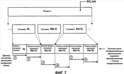 В то время, как устройство воспроизведения дисков фиг.6 воспроизводит файл аудиовидеоклипа, записанный на оптическом диске в соответствии со структурой данных фиг.8, когда контроллер 10 собирается воспроизвести сегмент 1, то контроллер 10 произвольно выбирает один из произвольных/перемешанных блоков сегмента 1. Определяется список воспроизведения или элемент воспроизведения, на которые указывает выбранный произвольный/перемешанный блок, и затем воспроизводится файл аудиовидеоклипа, который связан с этим списком воспроизведения или элементом воспроизведения. На фиг.8 также показано, что произвольные/перемешанные блоки воспроизведены в следующем порядке: RSU 1, RSU 3 и RSU 2.