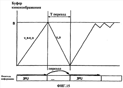 На фиг.15 изображено, что данные, которые хранятся в буфере киноизображения, воспроизводятся таким образом, чтобы в продолжение времени операции перехода данные киноизображения воспроизводились без разрыва даже там, где воспроизводится модуль перехода и после этого формируется переход в AV поток клипа, в котором хранятся данные киноизображения для другого ракурса. Операция перехода завершается и начинается воспроизведение модуля перехода следующего ракурса до того, как может случиться опустошение буфера. В случае устройства воспроизведения, требующего времени на операцию перехода, если предполагается, что худшим временем операции перехода является T_JUMP, скоростью считывания данных является V_R, а скоростью воспроизведения данных киноизображения является V_О, то размер модуля перехода должен удовлетворять условию: Размер модуля перехода>V_R*V_O*T_JUMP/(V_R-V_O). Также, буфер должен удовлетворять по меньшей мере следующему условию на размер: Размер буфера (B)>V_O*T_JUMP.