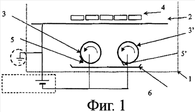 Металлическая полоса 2 соединена с массой, тогда как противоэлектроды 3,3 имеют положительный потенциал.