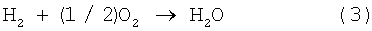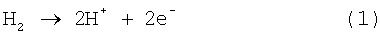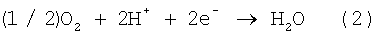 Ниже приведено описание принципа выработки электроэнергии в топливном элементе. В топливном элементе топливный газ, содержащий водород, подают на топливный электрод, а газ окислителя, содержащий кислород, подают на кислородный электрод, получая, таким образом, электродвижущую силу вследствие электрохимических реакций, происходящих между обоими электродами. Водород, поданный на топливный электрод, разделяют посредством катализатора на протоны и электроны. Отделенные электроны движутся к кислородному электроду через внешнюю схему, тогда как протоны движутся к кислородному электроду через твердотельную полимерную пленку. На кислородном электроде протоны, электроны и кислород соединяются, образуя воду. Ниже показаны электрохимические реакции в топливном элементе. Формула (1) указывает реакцию на топливном электроде, формула (2) указывает реакцию на кислородном электроде, а формула (3) указывает реакцию в батарее в целом.