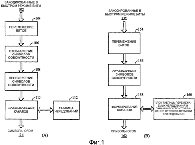 Фиг. 1А показывает устройство перемежения каналов в соответствии с вариантом осуществления. Фиг. 1В показывает устройство перемежения каналов в соответствии с другим вариантом осуществления. Устройство перемежения фиг. 1В использует исключительно устройство перемежения битов для достижения разнесения m-ичной модуляции и использует двумерную таблицу перемежаемых чередований и отображение чередования отрезков времени в чередование во время выполнения, чтобы достигать частотного разнесения, которое обеспечивает лучшую эффективность перемежения без необходимости в явном перемежении символов.
