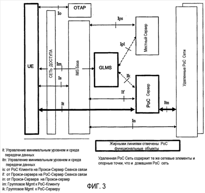 Фиг.3 изображает архитектуру PoC Версии 2, причем функциональные объекты PoC отмечены жирными линиями. На Фиг.3 показаны следующие интерфейсы:
