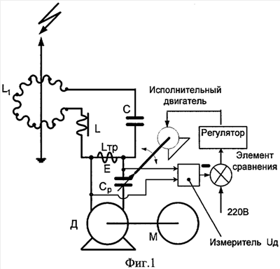 По мере затухания амплитуды колебаний контура автоматическая система управления, состоящая из датчика напряжения U на двигателе, элемента сравнения, исполнительного двигателя и автоматического регулятора, который, работая по принципу отрицательной обратной связи дискретно (или непрерывно, дискретно-непрерывно), изменяет емкость Ср с целью поддержания неизменным напряжение U (например, 220 В) на клеммах двигателя, что обеспечивает его штатную работу в диапазоне относительно медленного изменения амплитуды колебаний в контуре (L1+L, С, R). Такая ситуация может иметь место при высокой добротности контура последовательного резонанса в цепи двигателя, вследствие чего, по крайне мере, индуктивность трансформатора Lтр должна значительно превосходить индуктивность L статора двигателя.