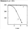 Часть гранулированного сока была размельчена. Размельченный сок после сушки при атмосферном давлении и температурах t 50°C и последующего дополнительного размельчения доведен до однородного состояния с размером частиц ~ 0,3 мм при влажности 9,7%. Гранулированный и размельченный соки оставлены на хранение. На чертеже приведены кривые изменения массовой доли витамина С в гранулированном (кривая 1) и порошкообразном (кривая 2) соках в процессе хранения в обычных условиях при комнатной температуре. Из кривых следует, что в результате шестимесячного хранения содержание витамина С в гранулированном соке уменьшилось на 4%, составив 286 мг/100 г, тогда как в порошкообразном соке за четыре с половиной месяца хранения его содержание уменьшилось на порядок величины до 34 мг/100 г.