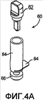 Фиг.4D – боковая вертикальная проекция, соответствующая фиг.4С; дозирующая насадка перемещается по отношению к первой части устройства, в результате чего происходит проникновение через вторую перегородку.