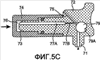 Пятое осуществление изобретения показано на фиг.5А-5С и заключается в следующем: устройство 70 содержит первую часть 72 с протыкающим перегородку выступом 73, в которой находится капиллярный канал 75; и вторую часть 74 с камерой 76 обрабатывающего раствора и перегородкой 78, герметизирующей камеру 76 обрабатывающего раствора. Первая часть 72 также содержит капиллярный канал 75, внутреннюю насадку 77 (имеющую узкую внутреннюю насадку 77А и широкий канал 77В для буферного раствора), смесительную камеру 79 и дозирующую насадку 71.