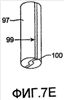 Седьмое осуществление изобретения согласно фиг.7А-7Е заключается в следующем. Устройство 90 содержит первую часть 92, вторую часть 94 и третью часть 97. Первая часть 92 содержит капиллярный канал 95. Третья часть 97 включает в себя камеру 96 обрабатывающего раствора и перегородку 98, герметизирующую камеру 96 обрабатывающего раствора. Проба крови (или другой текучей среды) поступает в капиллярный канал 95. Согласно фиг.7С: когда первая часть 92 вставлена во вторую часть 94, нижний конец первой части 92 проникает через перегородку 98 и содержимое камеры 96 обрабатывающего раствора вталкивается вверх через капиллярный канал 95. Содержимое камеры 96 обрабатывающего раствора смешивается с содержимым капиллярного канала 95. Это смешивающее течение текучей среды указано стрелками F на фиг.7С и 7D. Фиг.7Е показывает изображение в перспективе снизу третьей части 97: показаны боковые каналы 99 и нижний паз 100, который усиливает смешивание перед выведением текучей среды через дальний конец 101 устройства. Дальний конец 100 устройства 90 предпочтительно имеет форму как у дозирующей насадки, которая может входить во впускное отверстие измерительного прибора исследования крови.