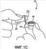 Согласно одному из предпочтительных способов работы данного устройства пользователь сначала использует обычное разрезающее кожу устройство, чтобы взять каплю крови. Затем, фиг.1 В, палец помещается сбоку корпуса протыкающего перегородку выступа 32, чтобы кровь заполнила капиллярный канал 34.