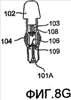 Наконец, согласно фиг.8F и 8G, дозирующую насадку 101 можно переместить относительно первой части 102, чтобы через вторую (т.е. нижнюю) перегородку 109 проникла первая часть. При этом смешанные кровь/обрабатывающий раствор выводятся из устройства через дозирующую насадку 101. В предпочтительных осуществлениях размер дальнего конца 101А дозирующей насадки 101 позволяет ему войти во вход измерительного прибора 10 исследования крови (который, как вариант, может быть гемометром A1c). Нужно отметить, что это осуществление изобретения можно также использовать с любым соответствующим анализатором текучей среды, или даже с простой емкостью (например, для приготовления пробы, которая помещается в лунку для анализа в будущем).
