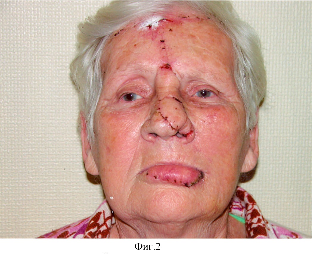 Одномоментно выполнена резекция нижней губы с двухэтапной пластикой резецированного участка носогубным кожно-жировым лоскутом слева. 28.10.07 кожные швы были сняты. Кожные лоскуты розового цвета, жизнеспособны, ишемии не отмечалось (Фиг.2). Больная выписана 05.11.07. Больная жалоб не предъявляет.