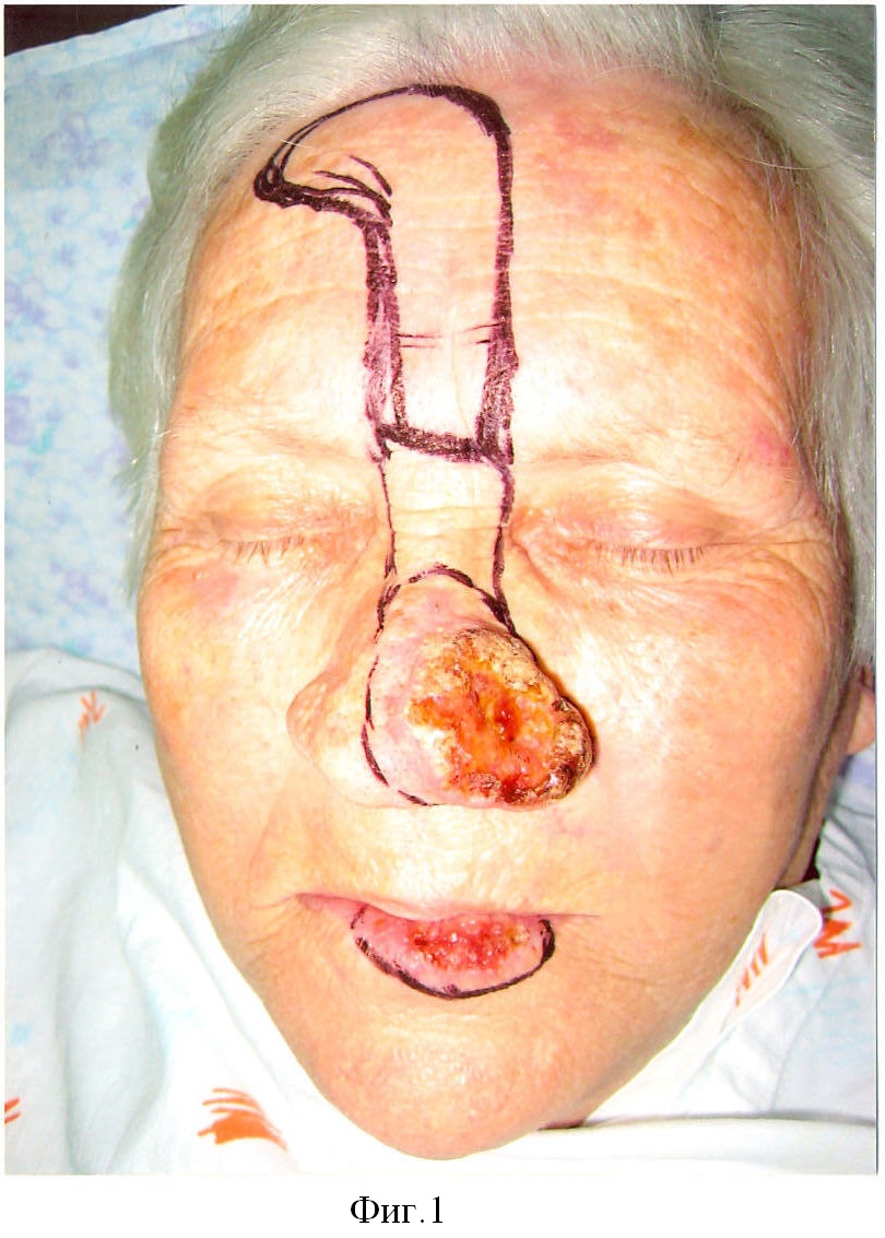 18 октября 2007 года произведено оперативное вмешательство. Больной предварительно произведена разметка лобного лоскута. Для разметки кожного лоскута применялся шаблон дефекта носа больной (Фиг.1). В данной ситуации был запланирован срединный лобный лоскут. В положении больной на спине, под местной анестезией раствором лидокаина 0,5% с адреналином 1:10000, выполнено удаление патологического очага, отступя от края образования до 1 см. В результате удаления опухоли образовался дефект кожных структур, крыльного хряща слева и слизистой 4,5 на 3,5 см. Выкроен кожный лобный лоскут согласно разметке в подапоневротическом пространстве с включением лобной мышцы. Ширина питающей ножки лоскута составила 1,5 см и включала в себя надблоковую артерию слева. В ходе мобилизации основания ножки разделена и резецирована наморщивающая мышца с сохранением всех основных питающих сосудов. Далее, подкожно в области надпереносья, от основания ножки лобного лоскута к дефекту на коже носа, сформирован тоннель. На участке лобного лоскута, который располагался подкожно, удален эпидермис, кожная лопасть была истончена. Деэпидермизированный лобный лоскут ротирован и через подкожный тоннель проведен в зону дефекта на носу. Перемещенный лобный лоскут вшит отдельными швами в зону дефекта носа, а дистальный участок лоскута сшит с остатками слизистой в полости носа, донорская рана на лбу ушита отдельными швами. Установлены резиновые дренажи.