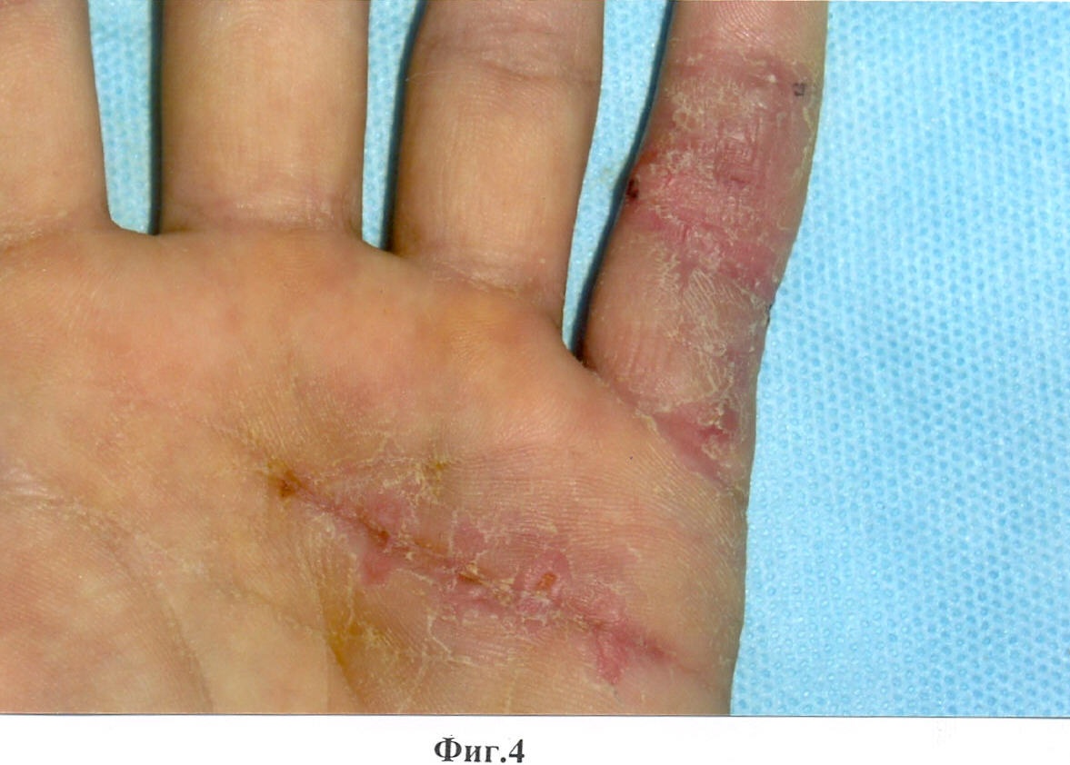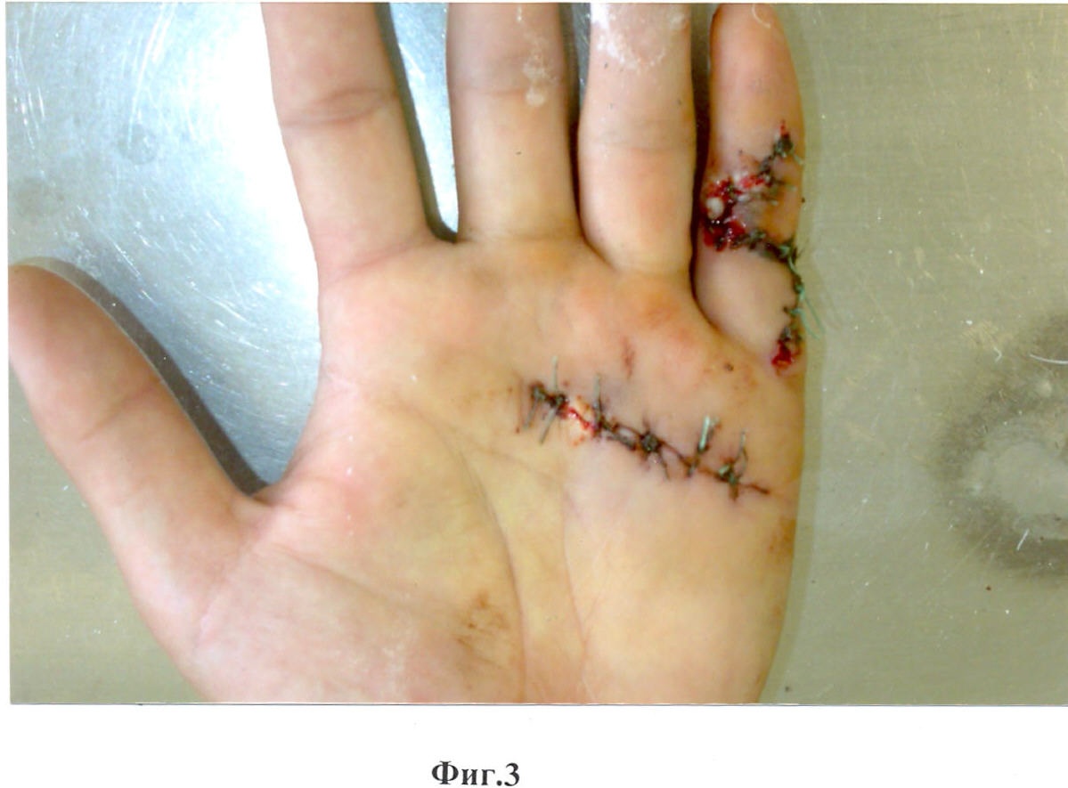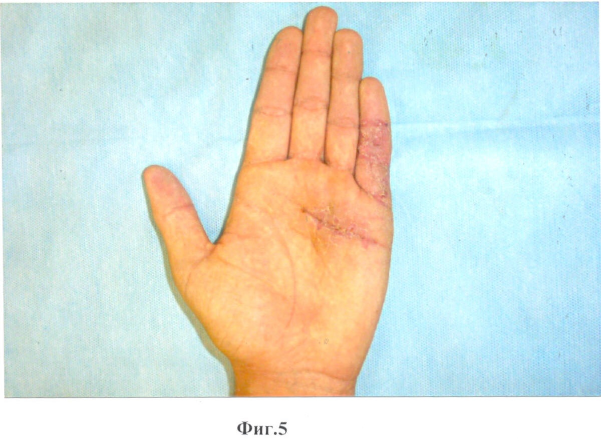Способ осуществляется следующим образом (см. рисунки). После соответствующей обработки кожи кисти под местной внутривенной анестезией 2% раствором новокаина «Z»-образным разрезом на 5 пальце с выкраиванием треугольных лоскутов по Лимбергу выделяют и иссекают перерожденный тяж апоневроза II порядка, выделяют сосудисто-нервный пучок, гемостаз по ходу операции, швы на кожу с местной кожной пластикой по Лимбергу. В целях профилактики развития контрактуры на ладони поперечным разрезом в области дистальной ладонной складки выделяют и иссекают тяжи апоневроза I порядка к 3-4-5 пальцам (фиг.3, 4, 5). Гемостаз по ходу опeрации, швы на рану на ладони. Резиновые выпускники, асептическая повязка, ладонная гипсовая лонгета.