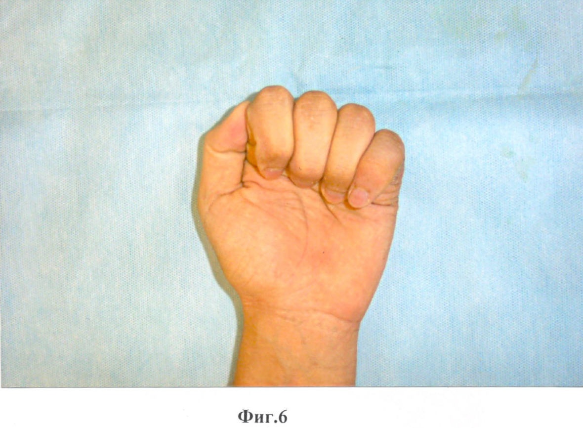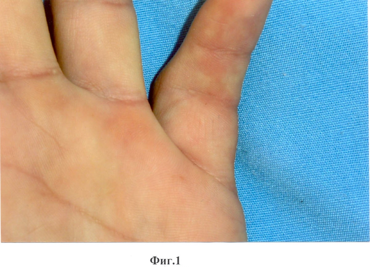 Способ поясняется иллюстрациями: на фиг.1 показан больной палец кисти до операции; на фиг.2 – вид сбоку, атипичная форма контрактуры Дюпюитрена 5 пальца; на фиг.3 – вид кисти на сроке 7 дней после операции; на фиг.4 – состояние рубцов на сроке 1 месяц; на фиг.5, 6 – функция пальца на сроке 1 месяц после операции.