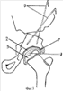 Для доступа к тазобедренному суставу используют один из известных способов. Поднадкостнично выделяют перешеек подвздошной кости 1. За перешеек подвздошной кости 1 заводят пилу Джильи. Пилой Джильи производят остеотомию 4 перешейка подвздошной кости 1. При этом распатором 6 отделяют надкостницу 5 по задней поверхности от ацетабулярного фрагмента. Однозубым крючком ротируют ацетабулярный фрагмент во фронтальной плоскости в пределах 35-40 град, в сагиттальной 30-50 град. Достигнутое положение фиксируется спицами Киршнера 9. Рана послойно ушивается.
