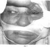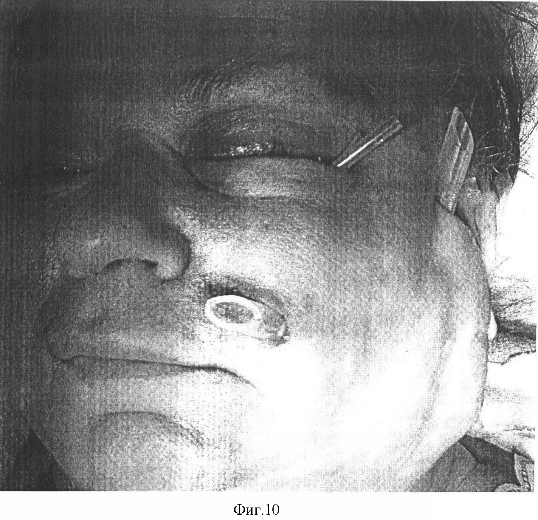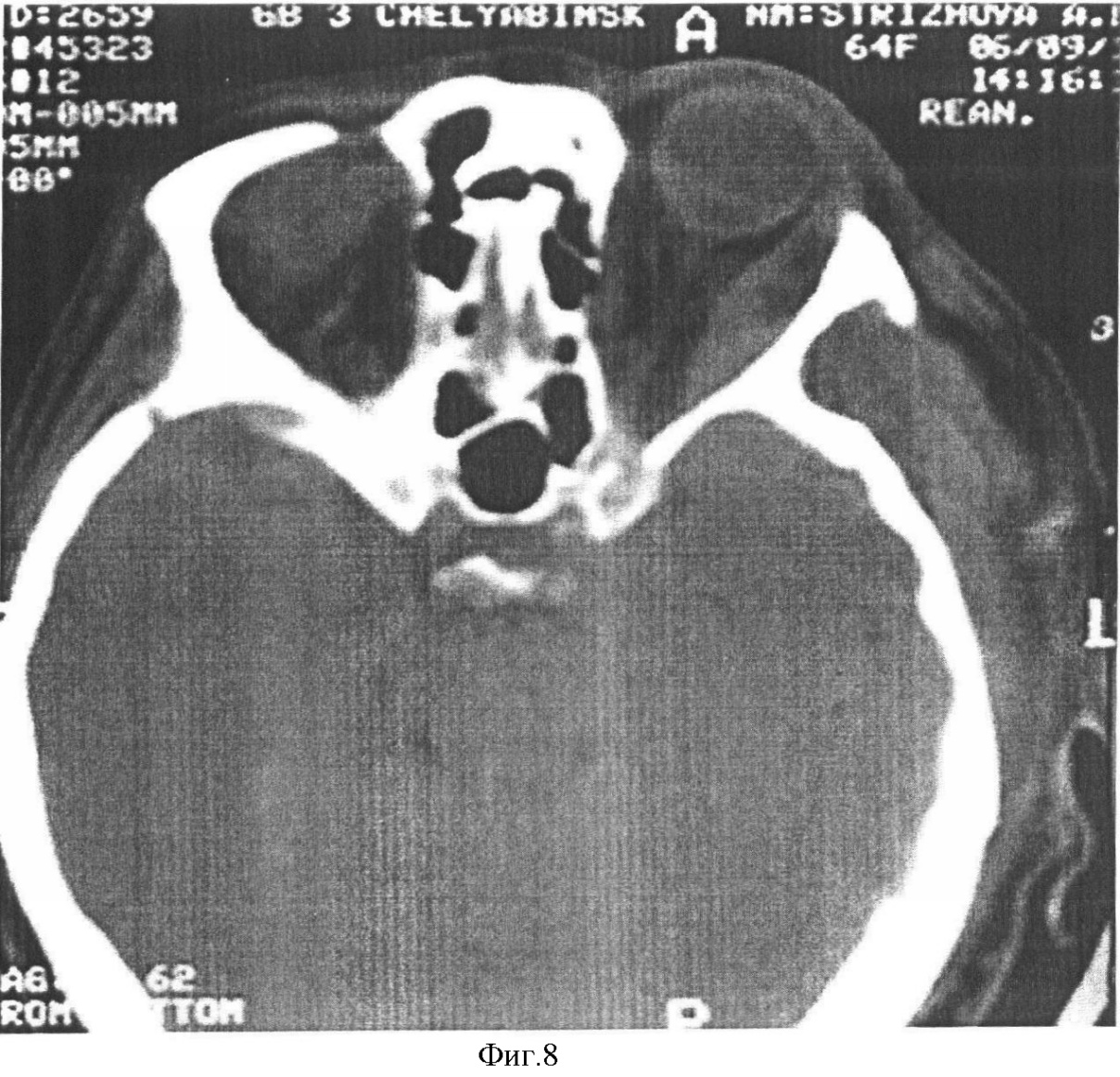Пример 1: Пациентке Стрижовой А.П., 64 года (ист. болезни 19207, сентябрь 2006 г.), 31 августа удален зуб (6) верхней челюсти. В течение 2 суток повысилась температура до 38°. Появился отек век, легкий экзофтальм. 3 сентября в стоматологической поликлинике выполнена периостотомия верхней челюсти в связи с развившимся гнойным периодонтитом, остеомиелитом. 4 сентября поступила в отделение челюстно-лицевой хирургии с гнойным гаймороэтмоидитом, флегмоной орбиты, щечной, подвисочной области, крылонебной ямки, тромбохом каверзного синуса слева. При поступлении температура 38,5°С, общая слабость, головная боль, тошната, с трудом открывает рот, гнойный экссудат в лунке удаленного зуба, отек верхней переходной складки полости рта, гиперемия кожи, инфильтрат щечной области 6·8 см. OS: visus=0, умеренная гиперемия, отек верхнего и нижнего век, умеренный экзофотальм кпереди (разница со здоровым 3 мм), полная офтальмоплегия, геморрагический хемоз с ущемлением между плотными веками, ДЗН бледно-розовый, четкие границы, артерии сужены, вены умеренно расширены (фиг.7). В крови лейкоцитоз 14,5·109 с нейтрофильным сдвигом влево до 18, повышены моноциты 10%, СОЭ 35 мм/ч, сахар 6,3 ммоль/л, ацетон в моче, гиперкоагуляция. На рентгенограмме черепа обнаружено тотальное затемнение гайморовой пазухи слева. При компьютерной томографии обнаружено образование вдоль нижне-наружной стенки орбиты до вершины 35·9 мм с неоднородным содержимым; деструкции нижней костной стенки орбиты; повышение плотности ретробульбарной клетчатки; уровень жидкости в гайморовой пазухе (фиг.8). Неврологом выявлены ригидность затылочных мышц, симптомы Бабинского, Кернига; в ликворе – белок, нейтрофилы. Через 6 часов с момента поступления произведена операция при совместном участии офтальмолога, оториноларинголога, челюстно-лицевого хирурга: ревизия зоны удаленного зуба, вскрытие и дренирование флегмоны щечной области, подвисочного пространства, кралонебной ямки, гаймороэтмотдотомия, одномоментная орбитотомия со вскрытием и двойным дренированием поднадкостничного пространства, диагностирован субпериостальный абсцесс, выполнена секвестрэктомия нижней стенки орбиты, дренирование субпериостального пространства в гайморову пазуху и наружу, вскрытие ретробульбарной клетчатки (фиг.9, 10). При бактериологическом исследовании выявлен Staphylococcus aureus, Enterococcus faecium. В послеоперационном периоде лечение проводилось в условиях отделения интенсивной терапии с применением антибиотиков широкого спектра (тиенам, цефепим); дезинтоксикационных, антикоагулянтных, сосудистых, ноотропных препаратов (солевые растворы, реополиглюкин, гепарин, фраксипарин, аспирин, пентоксифиллин, ноотропил, актовегин). В течение первой недели гнойная инфекция купирована, снизилась температура, гнойное отделяемое из орбиты исчезло на 5 сутки, дренажи удалены на 9 сутки. 13 сентября наложены вторичные швы на нижнее веко (фиг.11). Через 3 недели полностью восстановилась подвижность глаза, правильное положение глазного яблока и век, глазная щель симметрична.