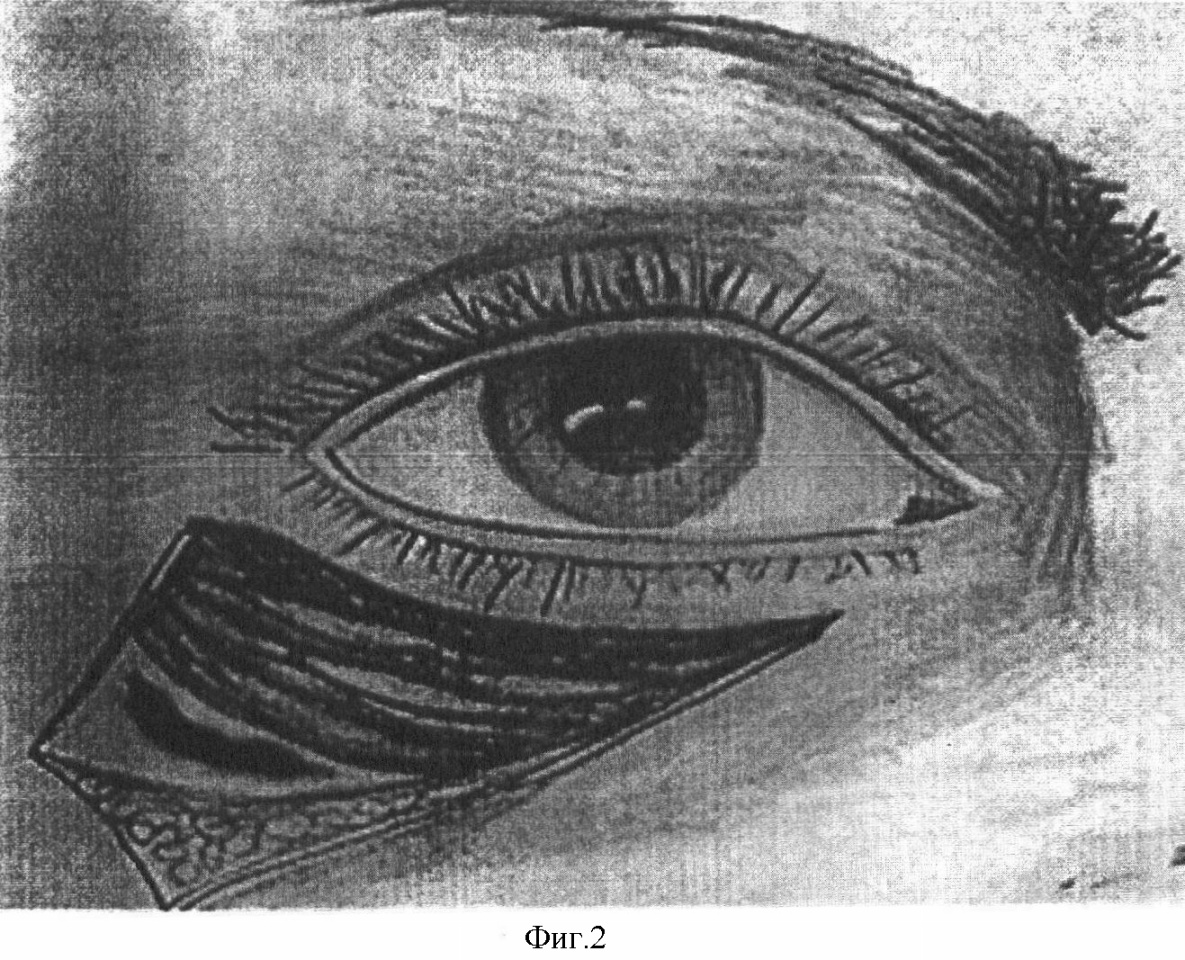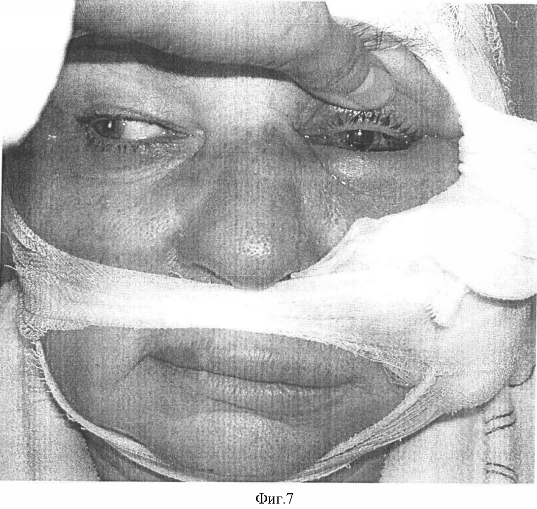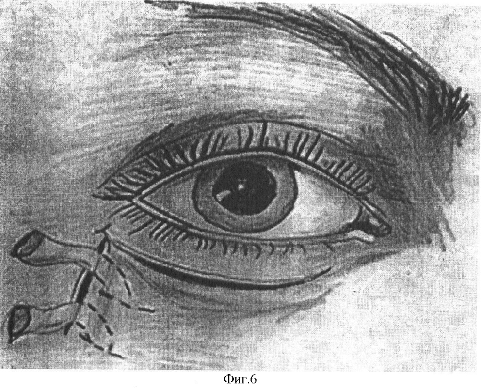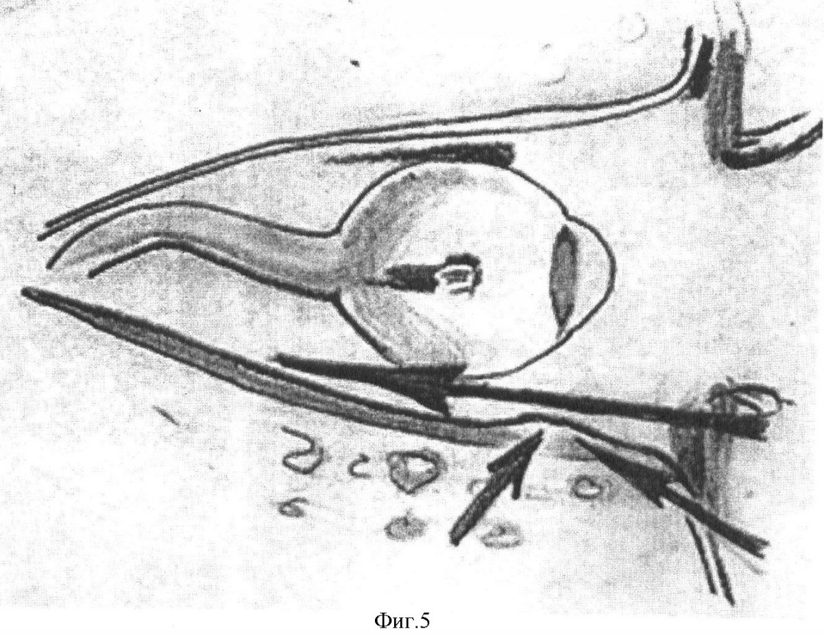 Далее на 2 этапе рассекают тарзо-орбитальную фасцию в 2 мм выше края орбиты длиной 1 см, вскрывают ретробульбарную клетчатку до вершины орбиты на 4 см, диагностируют флегмону орбиты, полихлорвиниловый дренаж выводят на кожу (фиг.4, 5). Накладывают направляющие швы Prolen 6/0 на разрез периоста, тарзо-орбитальной фасции, укладывают кожно-мышечный лоскут и подшивают в наружной части раны поверх выведенных дренажей (фиг.6).