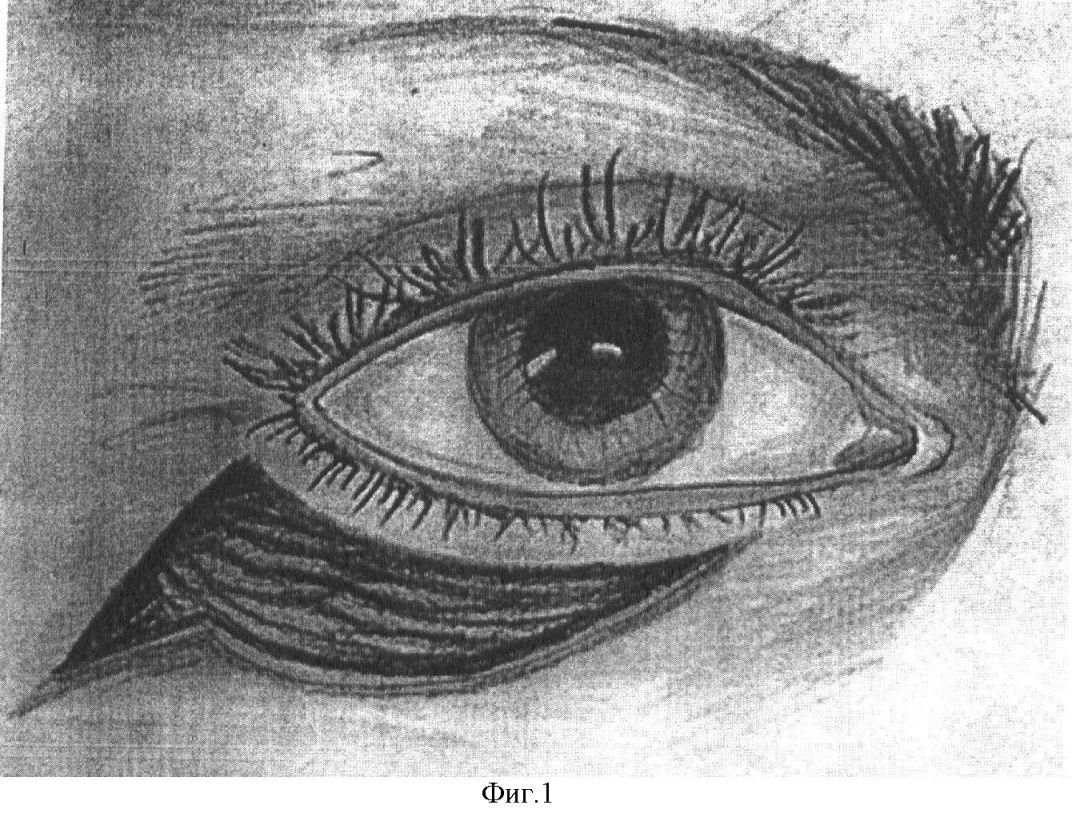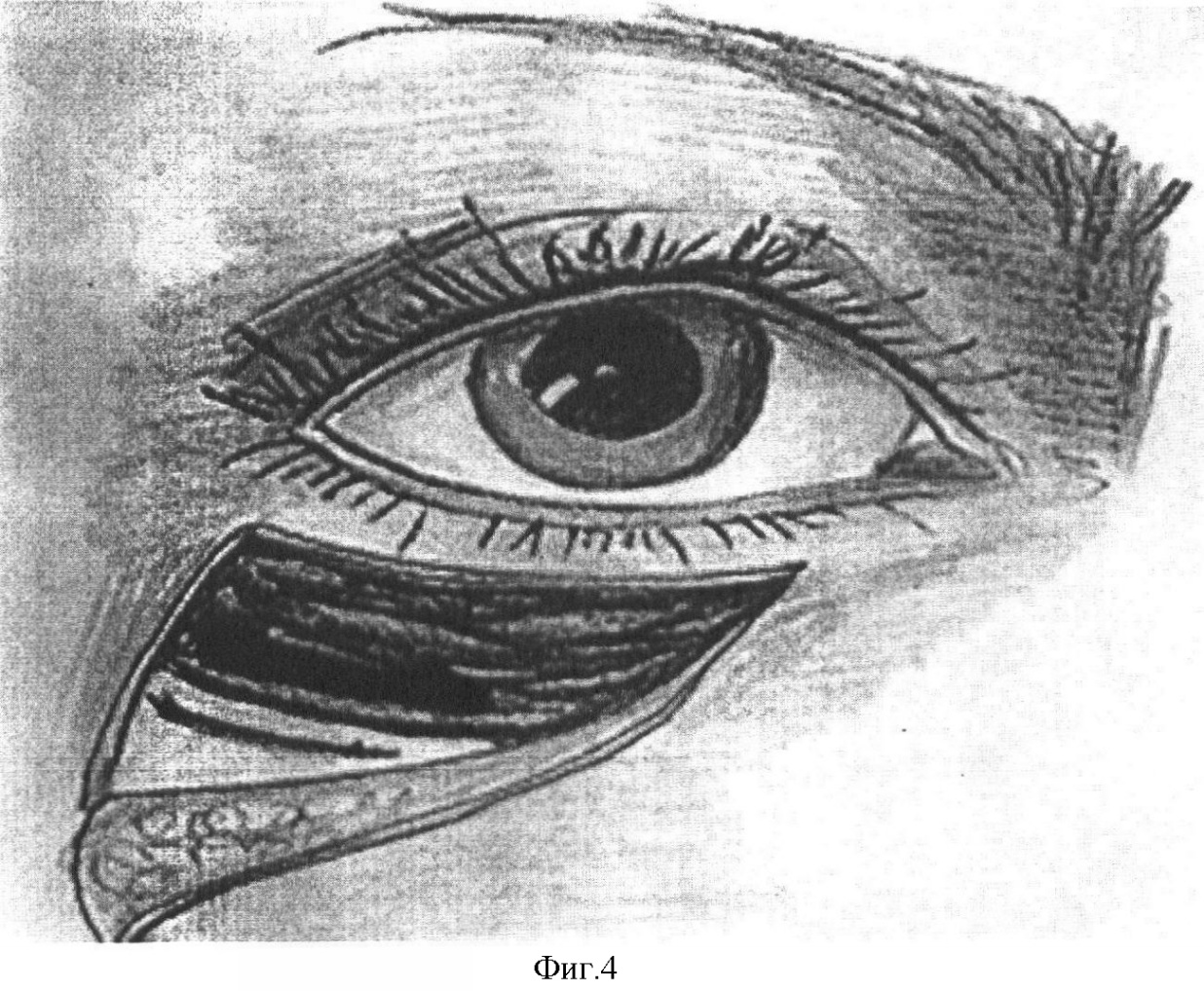 Под интубационным наркозом проводят разрез кожи в 2 мм от ресничного края в наружной части нижнего века до наружной спайки. Отсепаровывают кожно-мышечную пластинку века на всем протяжении до нижнего орбитального края (фиг.1). Последовательно на 1 этапе по нижнему орбитальному краю, отступая на 2-3 мм книзу, проводят разрез надкостницы длиной 1,5-2,0 см, отслаивают периост кверху, диагностируют субриостальный абсцесс, субпериостальное пространство промывают раствором хлоргексидина 0,05%, одновременно осуществляют ревизию нижней стенки орбиты, удаляют костные секвестры (фиг.2). Выполняют двойное дренирование субпериостального абсцесса – в гайморову пазуху путем формирования отверстия диаметром 3-5 мм в нижней стенке орбиты и – наружу по трубочному дренажу в рану (фиг.3).
