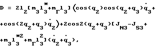Датчики 24 и 22 установлены соответственно во второй и третьей степенях подвижности робота /см. фиг. 2/ и измеряют соответственно обобщенные координаты q2, q3. Сумматор 23 имеет положительные входы с единичными коэффициентами усиления, поэтому на его выходе формируется сигнал q2+q3. Усилители 41 и 49 имеют коэффициенты усиления 2. Сумматор 42 имеет единичные коэффициенты усиления, но его второй вход /со стороны датчика 22/ отрицательный. Поэтому на выходе сумматора 42 формируется сигнал 2q2+q3. Функциональные преобразователи 25, 29, 43, 50 и 51 реализуют функцию SIN, а функциональные преобразователи 27, 31, 58, 66 и 76 – функцию COS. В результате на выходе третьего 26, четвертого 28, пятого 30 и шестого квадраторов соответственно формируются сигналы,SIN2q2, COS2q2, SIN2(q2 + q3) и COS2(q2 + q3). Первый /со стороны функционального преобразователя 27/ и второй положительные входы сумматора 33 соответственно имеют коэффициенты усиления l2 и l*3.. В результате на выходе квадратора 15 формируется сигнал [l2cosq2+l*3cos(q2+q3)]2. Первый /со стороны функционального преобразователя 27/ и второй положительные входы сумматора 9 соответственно имеют коэффициенты усиления l2 и l3. В результате на выходе блока 11 умножения формируется сигнал mг[l2cosq2 + l3cos(q2 + q3)]2, т.к. датчик 12 измеряет массу захваченного груза mг. На выходе задатчика 14 сигнала формируется сигнал Jip2 + JS1, где J – момент инерции ротора электродвигателя и вращающихся частей редуктора /приведены к валу двигателя/, p – передаточное отношение редуктора. Первый /со стороны блока 11/ и второй /со стороны задатчика 14 сигнала/ положительные входы сумматора 13 имеют единичные коэффициенты усиления. Его третий /со стороны квадратора 26/, пятый /со стороны квадратора 28/, шестой /со стороны квадратора 30/ и седьмой /со стороны квадратора 32/ положительные входы имеют коэффициенты усиления JS2, JN2+m2l*32, JS3, JN3 и m3 соответственно. В результате на выходе этого сумматора формируется сигнал: ![]() Датчики скорости 39 и 21 устанавливаются соответственно во второй и третьей степенях подвижности робота /см, фиг. 2./ и измеряют соответственно ![]() На выходе задатчика 34 сигнала формируется сигнал m3l22+JN2-JS2+m2l*22. Первый /со стороны задатчика 34 сигнала/ и второй положительные входы сумматора 35 соответственно имеют единичный коэффициент усиления и коэффициент усиления, равный l22. В результате на выходе блока 36 умножения формируется сигнал [JN2-JS2+m2l*22+(m3+mГ)l22]sin2q2. Задатчик 16 сигнала формирует сигнал JN3-JS3+m3l*32. Первый /со стороны задатчика 16 сигнала / и второй положительные входы сумматора 17 соответственно имеют единичный коэффициент усиления и коэффициент усиления l32. В результате на выходе блока 18 умножения формируется сигнал [JN3-JS3+m3l*32+mГl23]sin2(q2+q3). Задатчик 45 сигнала формирует сигнал 2l2l*3m3. Первый /со стороны задатчика 45 сигнала/ и второй положительные входы сумматора 46 соответственно имеют единичный коэффициент усиления и коэффициент усиления 2l2l3. В результате на выходе блока 44 умножения формируется сигнал 2l2(m3l*3+mГl3)sin(2q2+q3). Три положительные входа сумматора 37 имеют единичные коэффициенты усиления. Поэтому на выходе блока 38 умножения формируется сигнал ![]() На выходе блока 47 умножения формируется сигнал 2l2[m3l*3+mГl3]cosq2, поэтому с учетом того, что оба положительных входа сумматора 19 имеют единичные коэффициенты усиления, на выходе блока 20 умножения формируется сигнал ![]() Оба отрицательных входа сумматора 40 име