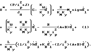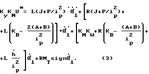 В результате на выходе сумматора 3 формируется сигнал![]() Кинетическая энергия всех движущихся масс исполнительного органа робота представляется в виде ![]() а потенциальная энергия имеет вид ![]() Учитывая, что ![]() ![]() ![]() Из уравнения Лагранжа 2 рода несложно получить ![]() Учитывая, что U = KyU*, q1ip= 1, а также из уравнения электрической цепи и механической цепи /с учетом соотношения (2)/ для электродвигателей постоянного тока с постоянными магнитами или независимого возбуждения, несложно показать, что рассматриваемый привод, управляющий координатой q1 робота, можно описать следующим дифференциальным уравнением![]() Сформированный сигнал U* (1), как несложно убедиться, обеспечивает превращение уравнения (3) с существенно переменными параметрами в уравнение с номинальными постоянными (желаемыми) параметрами: обеспечивающими рассматриваемому приводу поворота заданные динамические свойства и качественные показатели работы за счет постоянных значений JН и Ку.